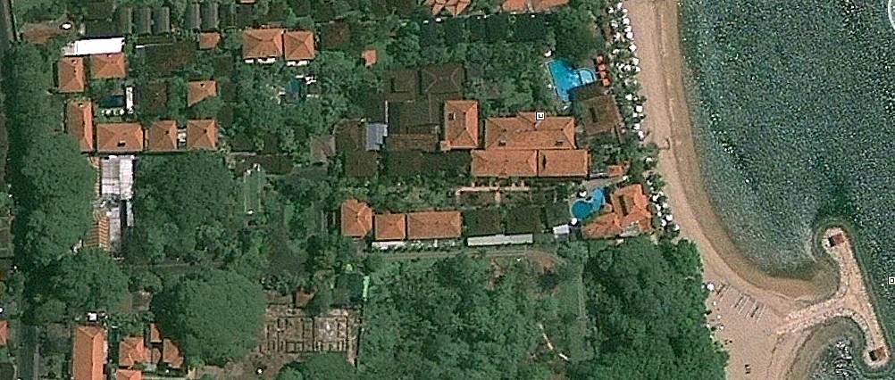 | The new villas are under that enormous round tree at bottom left. The beach path leads to the right of it, below centre, below the kidney shaped pool. |