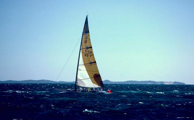 | Americas Cup racing, 1986 with Rottnest Island in the distance © PJ Croft 2012 |