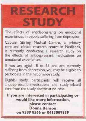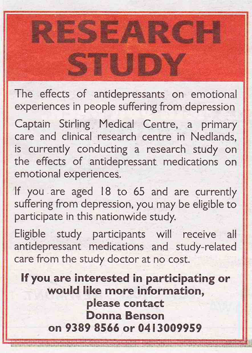 The Captain Stirling Medical Centre is going to get a call from me. I’m not on antidepressant medication now, but this is too good a story to keep secret. I’ve got them all diarised.