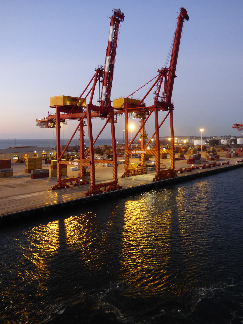 The departure of both ships, the Arcadia and the Queen Mary from Fremantle, was delayed an hour because, I was told, someone hadn’t turned up. The Queen Mary II was in front of us and I’m not sure who was lacking a passenger, them or us, but I got to see the QM II ease away from the wharf and motor out into the sunset. It was quite spectacular.