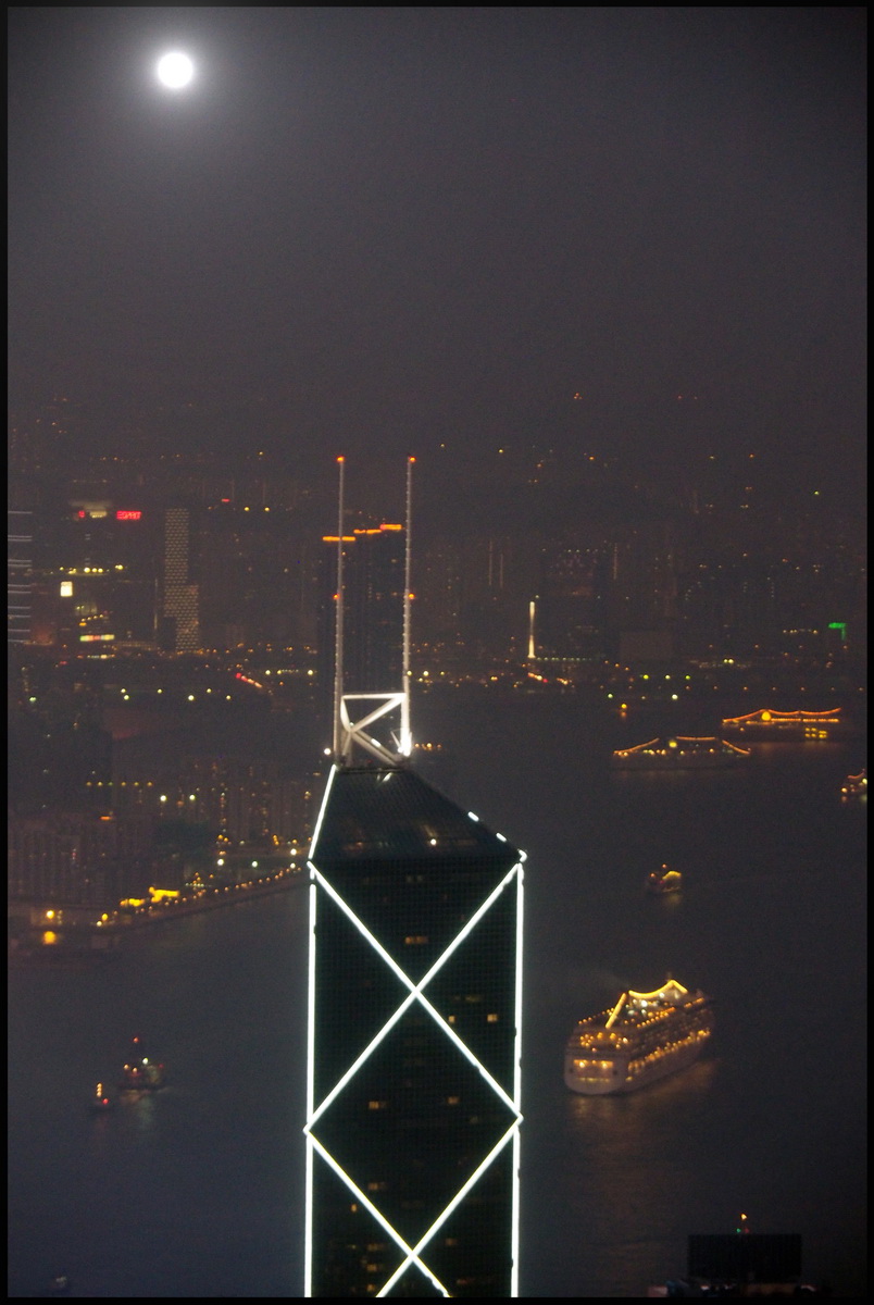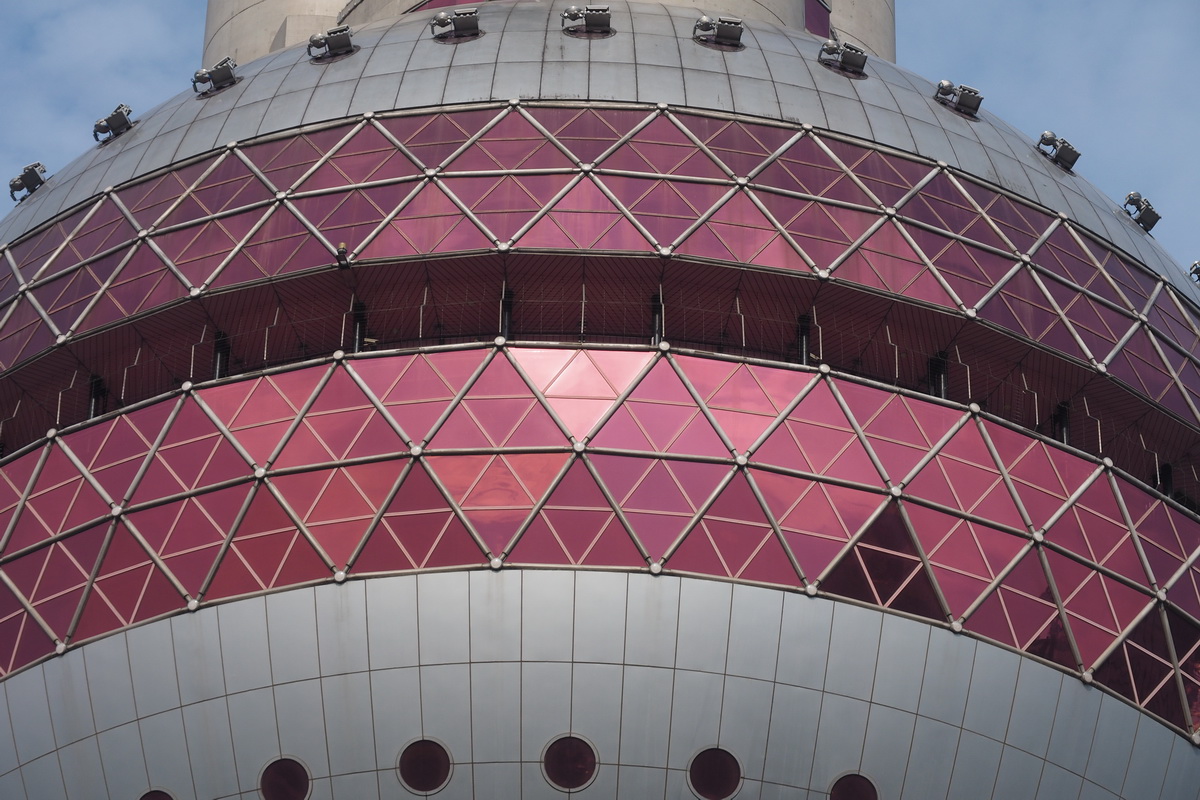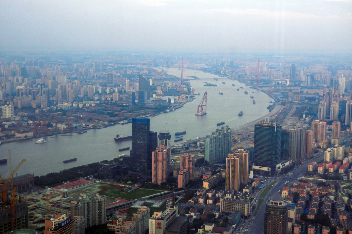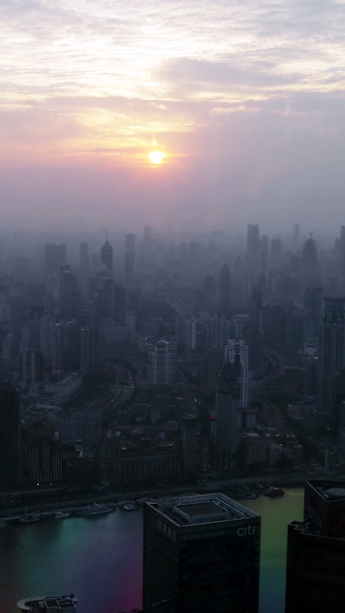 1545 we set off to the Jin Mao Tower – another 30 min drive through heavy traffic. More queuing for the lift. Only one of two lifts is operating. About 25 passengers per lift, so it was a long wait. Finally we’re off up the tower, at a 9.1m/s rise. Ears pop, then about 60 secs later we’re at the top and joining the crowds. I’m a bit tired of crowds.