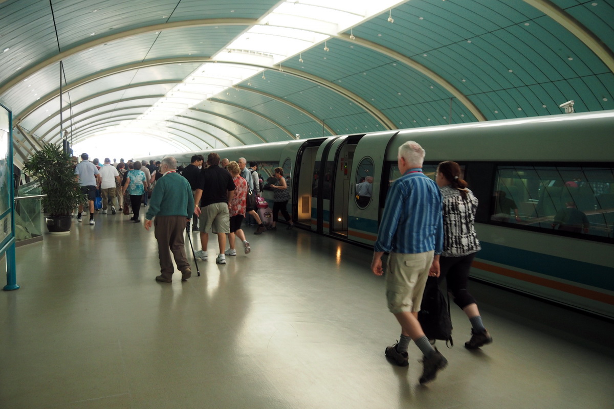 Bus via financial district to the Mag Lev train station to catch the 3pm train, with Darren talking non-stop. He doesn’t tell us what we’re passing until we’re past it. Annoying.