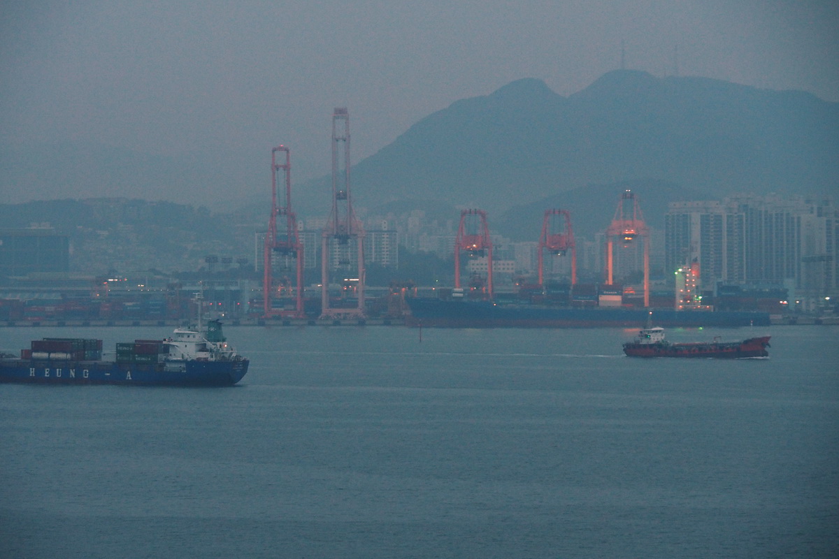 Into Shanghai (Guangzhou) harbour this morning. It was a slow, late entry, no doubt dictated by the port authorities. We came in at a heading of about 290deg. and a speed of 21Km/h, sometimes down to 16Kmh. Ships everywhere, hundreds of them, some alongside us going in, others steaming out. We seemed to pass around an island in this huge river mouth, changing course many times, sometimes seeming to join the stream of ships going in. The water is muddy brown, presumably river silt. There were several dredges hard at work. It’s a beautiful clear autumn day, about 22C maximum forecast.
