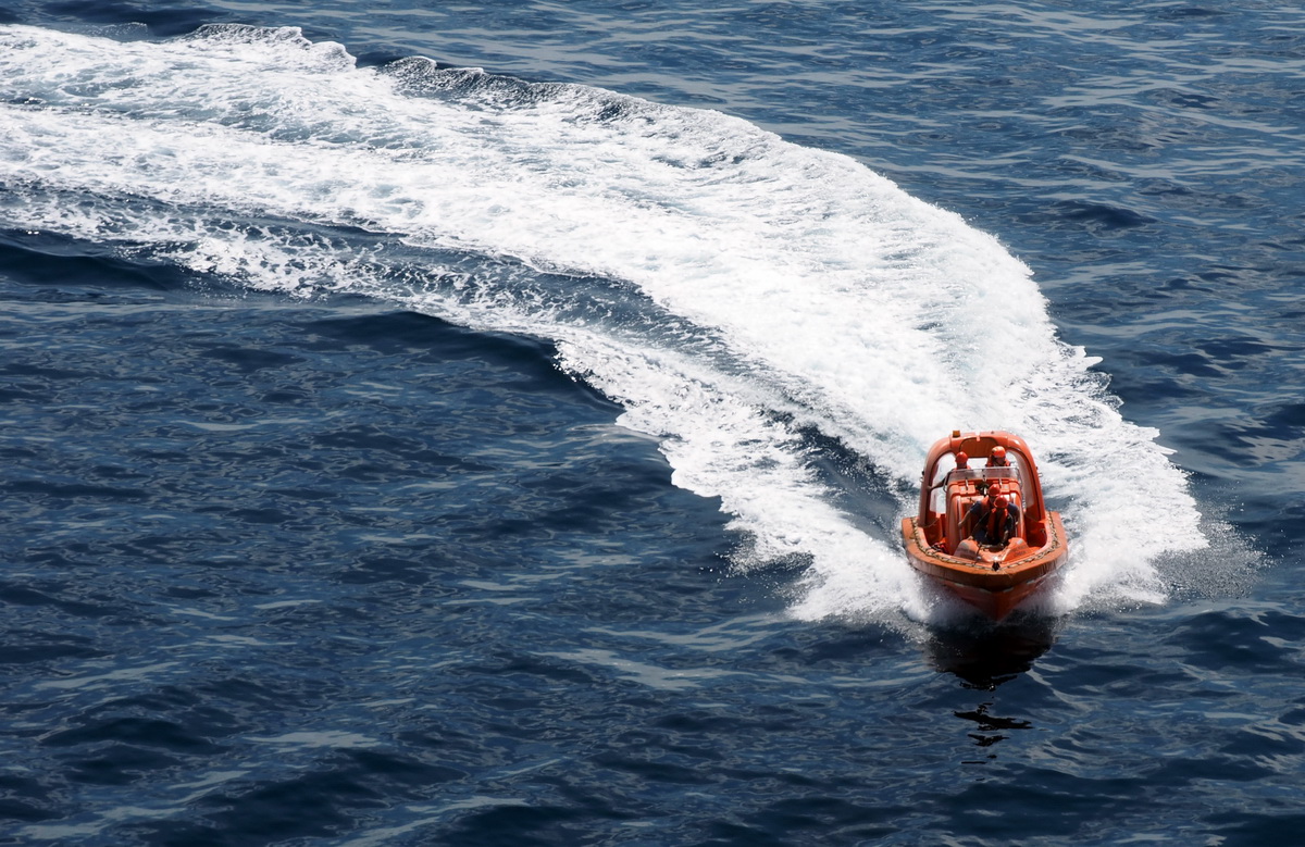 The swimmers were taken by this launch to a nearby fishing boat to be taken ashore. It cost the ship more than an hour, doing a full circle, slowing to a stop, then accelerating again. It must have cost tens of thousands of dollars in time and fuel.