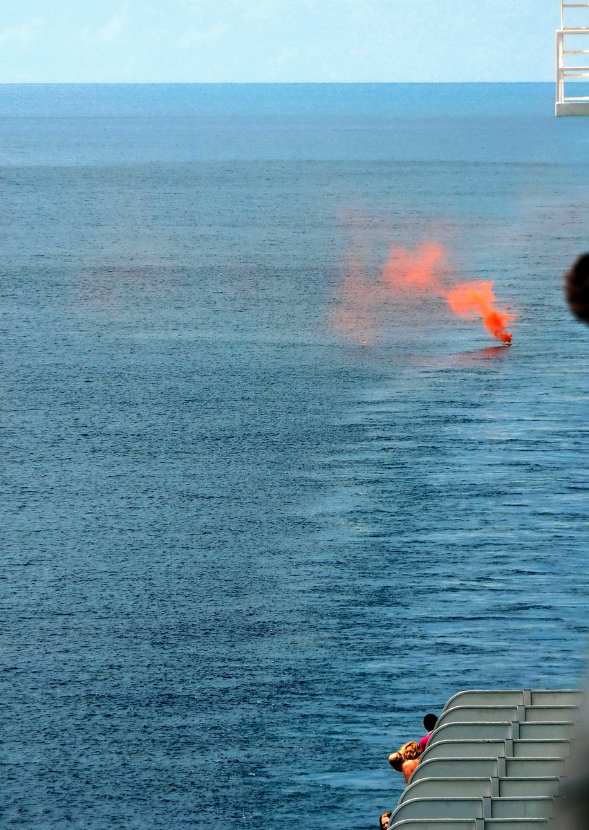The ship immediately began to slow and turn to starboard, my side. An orange life ring was thrown overboard (above) and it started trailing copious amounts of orange smoke. You don’t turn a 155,000 tonne ship around easily. I reckon it took more than 3Km and 20 mins to go around 180 deg. Soon we were pointing in the opposite direction and could see a large island about 10Km away, at least. There were around a dozen Vietnamese fishing boats in the area too, but none of them made any moves.