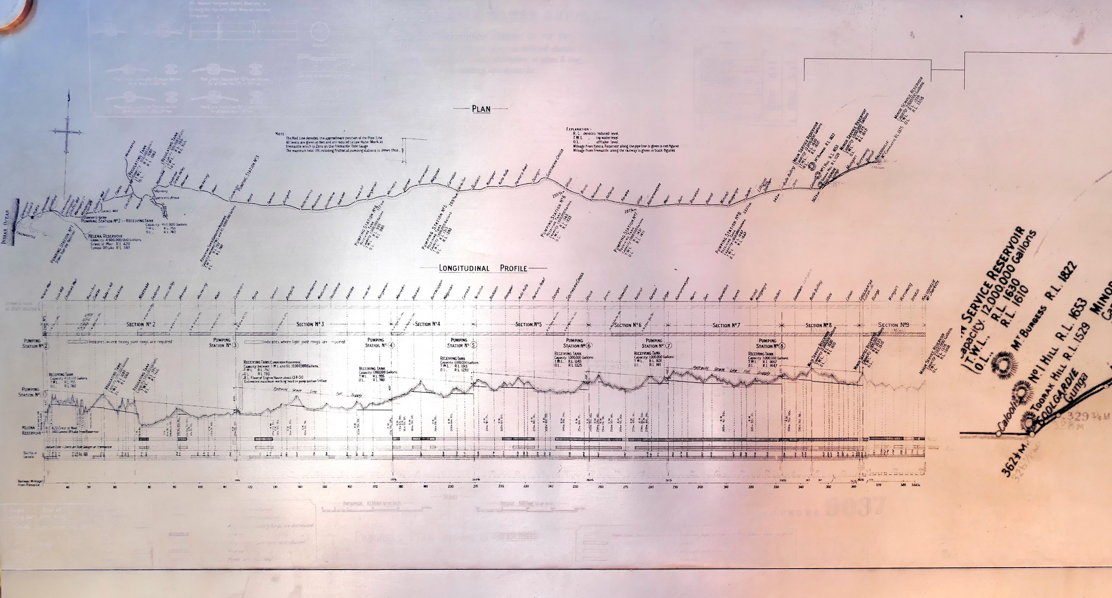 Stainless steel engraving at Mt Charlotte, showing heights and distances. I’d like to print this.I didn’t realise how far the pipeline extends into the countryKalgoorlie from the end of the pipeline, the reservoir.