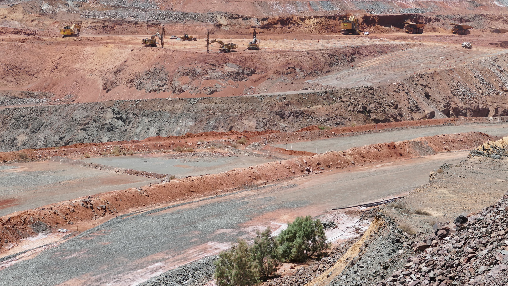 Those trucks are about 330m down and take 45mins to drive up to the top (at 15Km/h).Get some idea of the scale by the drill head at the top in the distanceDrilling shot holes in a pattern for a big blast. We missed it.