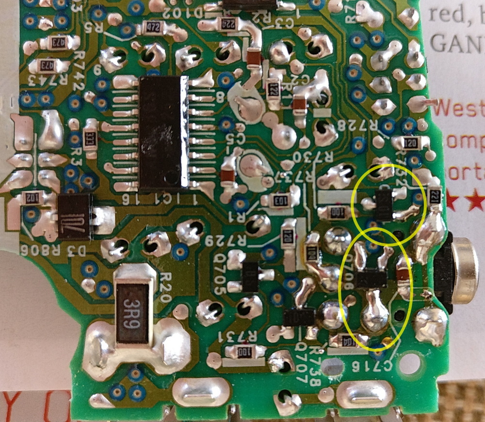 I suspect it’s the output transistors for the headphone socket, since there’s a certain amount of shorting happening when you put the plug in. But I’ve looked at it and decided it’s a write-off. There’s no way I can desolder these tiny components, and even if I could, I very much doubt I could get replacements. Even if I could, soldering them back in? You need special soldering tools for this work, and it’s expensive.
