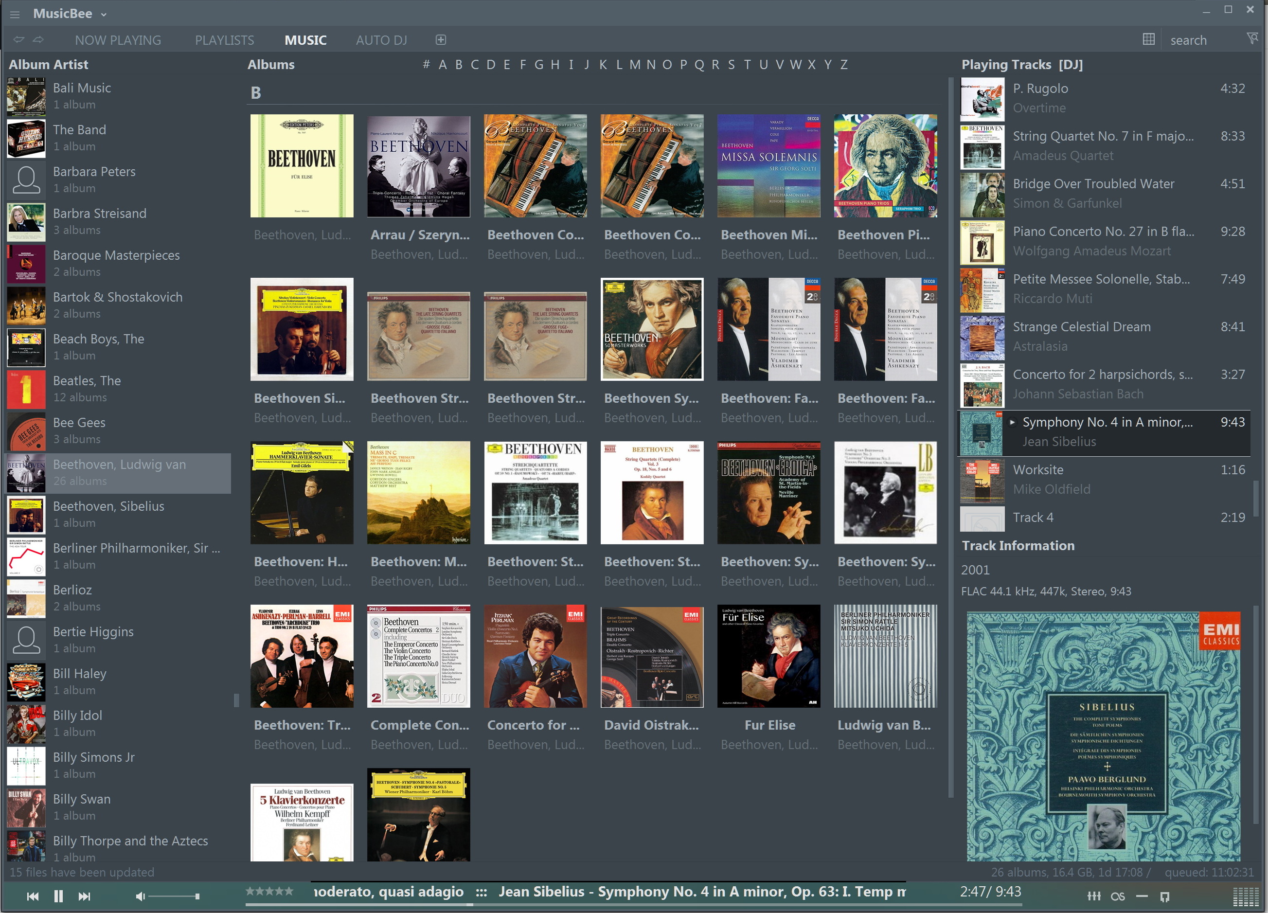 The centre panel shows all the covers in a particular folder, in this case Beethoven. Click on any cover image and you get a list of the tracks.