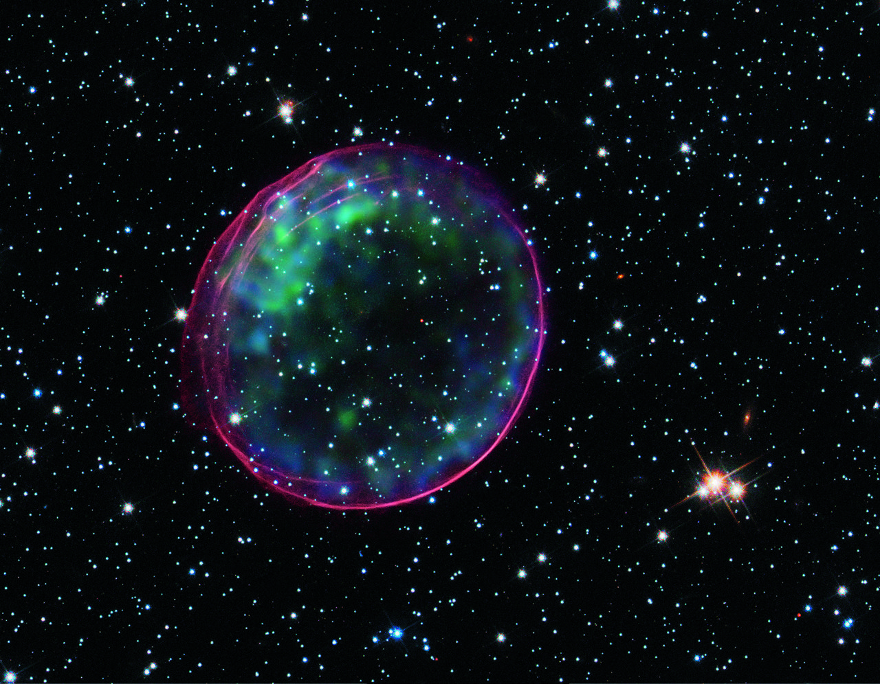 This composite image contains X-ray data from Chandra (green and blue) that shows heated material in the centre of a shell generated by a supernova explosion. Optical data from Hubble show the glowing pink rim, which is ambient gas being shocked by the blast wave from the supernova, as well as the surrounding star field. The Type Ia supernova that resulted in the creation of this remnant would have been visible from Earth some 400 years ago.