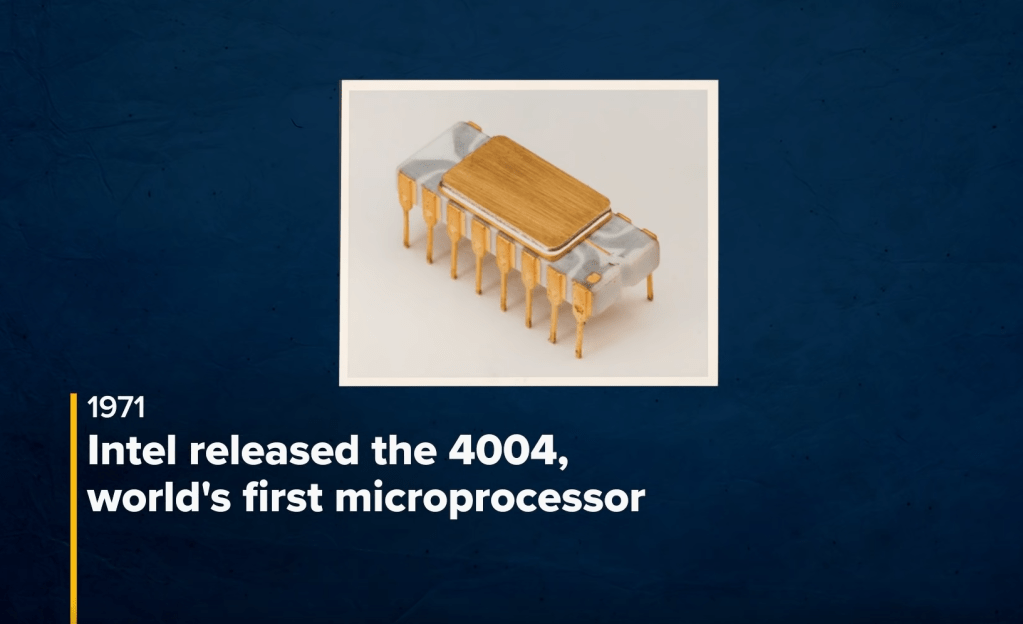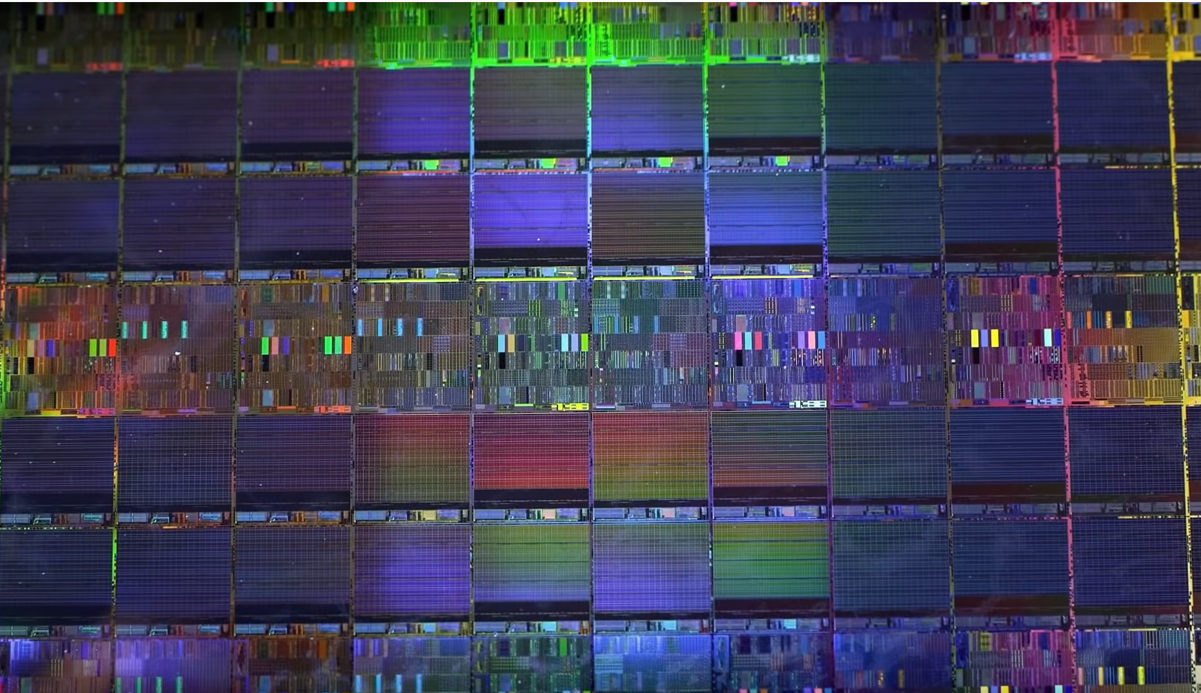 Present day CPUs on a large silicon die. These are multiple copies on a large wafer. They will be snapped apart along the lines above before being individually tested and packaged.